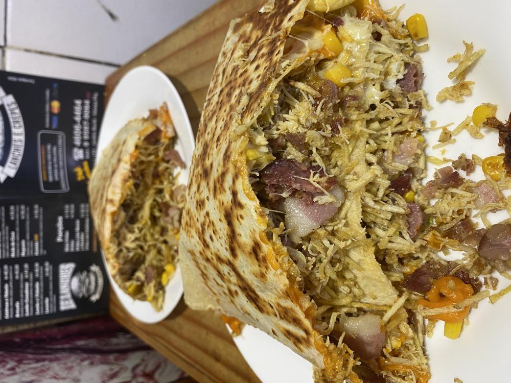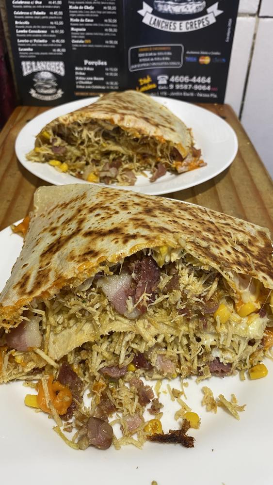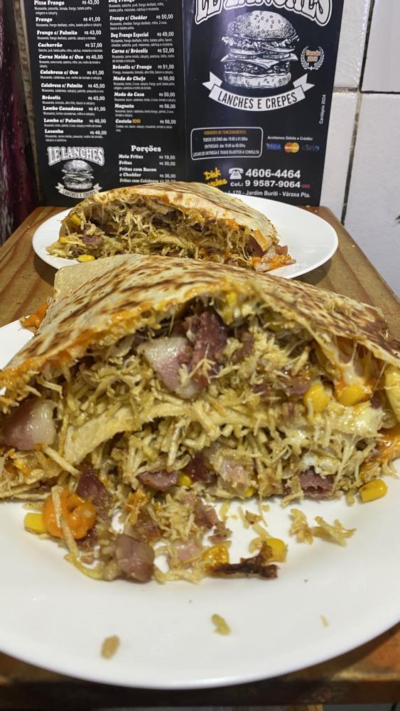 mussarela, cheddar, frango desfiado, milho, 2 ovos, bacon e batata palha.