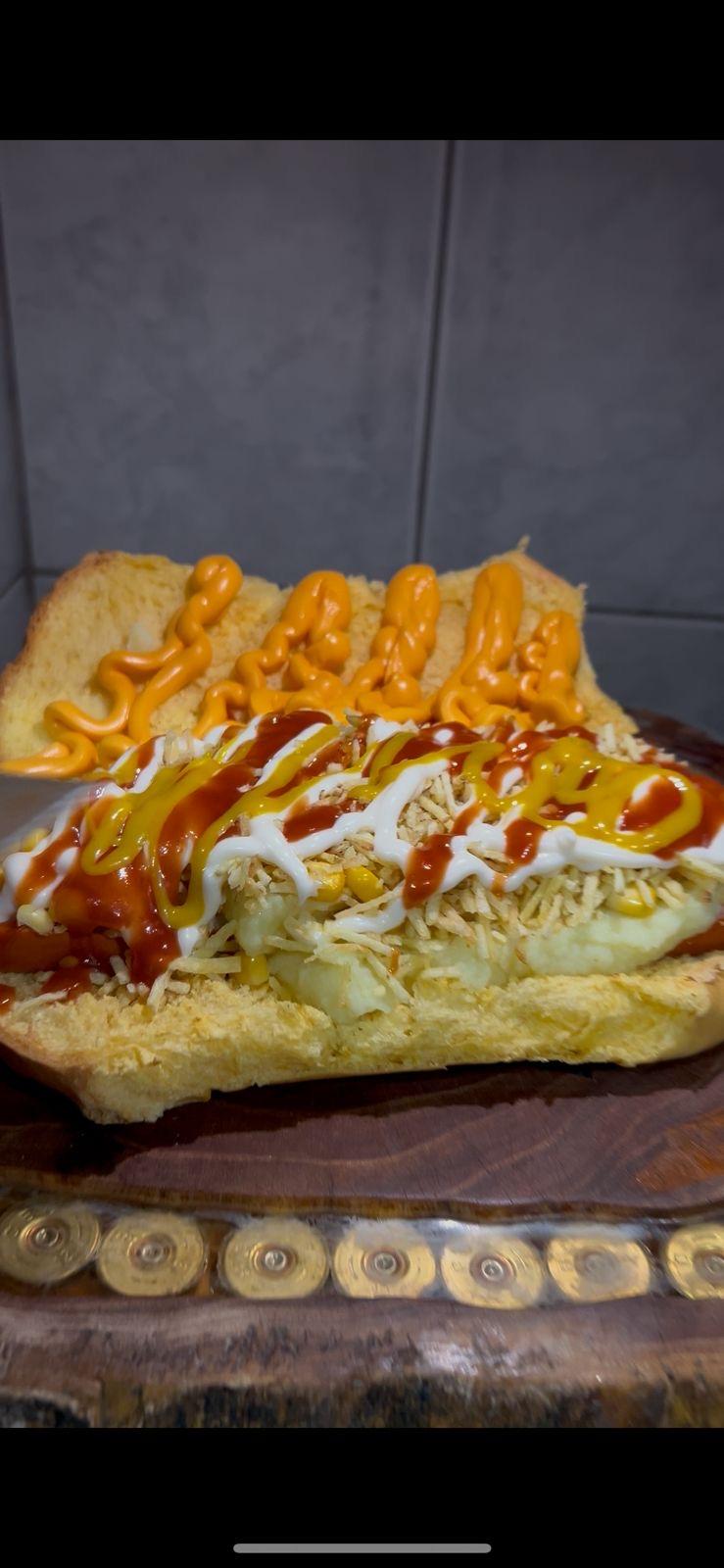 Salsicha, Purê, Milho, Batata palha, Cheddar, Maionese, Catchup e Mostarda